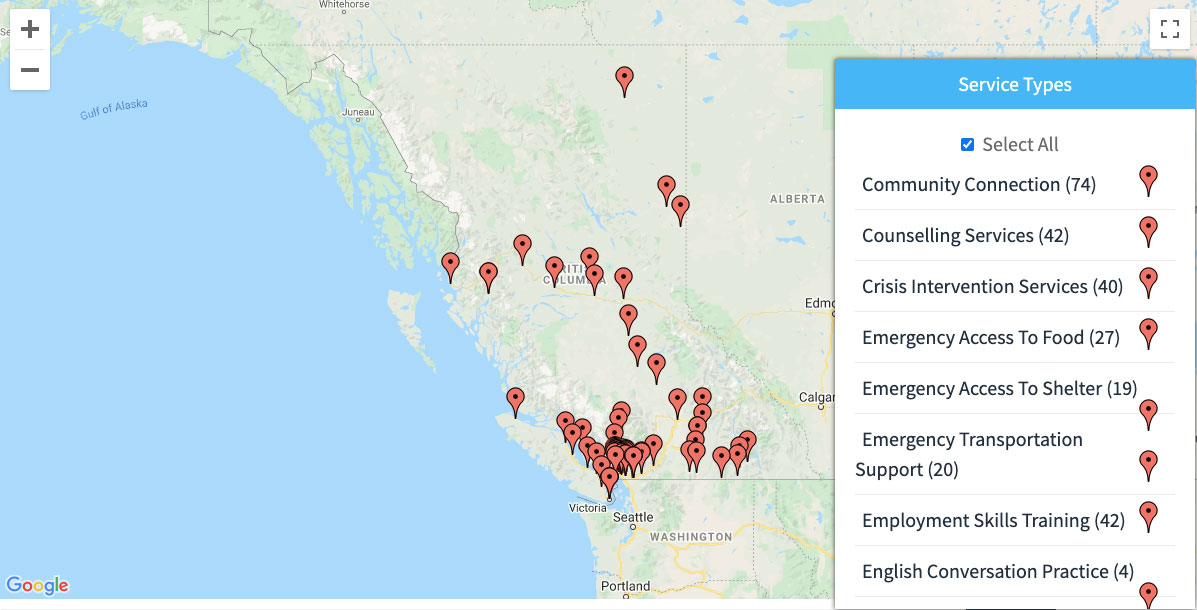 The idea behind this map was that organizations and individuals can use the map to find and connect with organizations supporting Migrant Workers. With over a 100 different tags marking the locations of supports available to Migrant Workers across the five regions of British Columbia, this map is a good tool to refer to when looking at services available in your region.