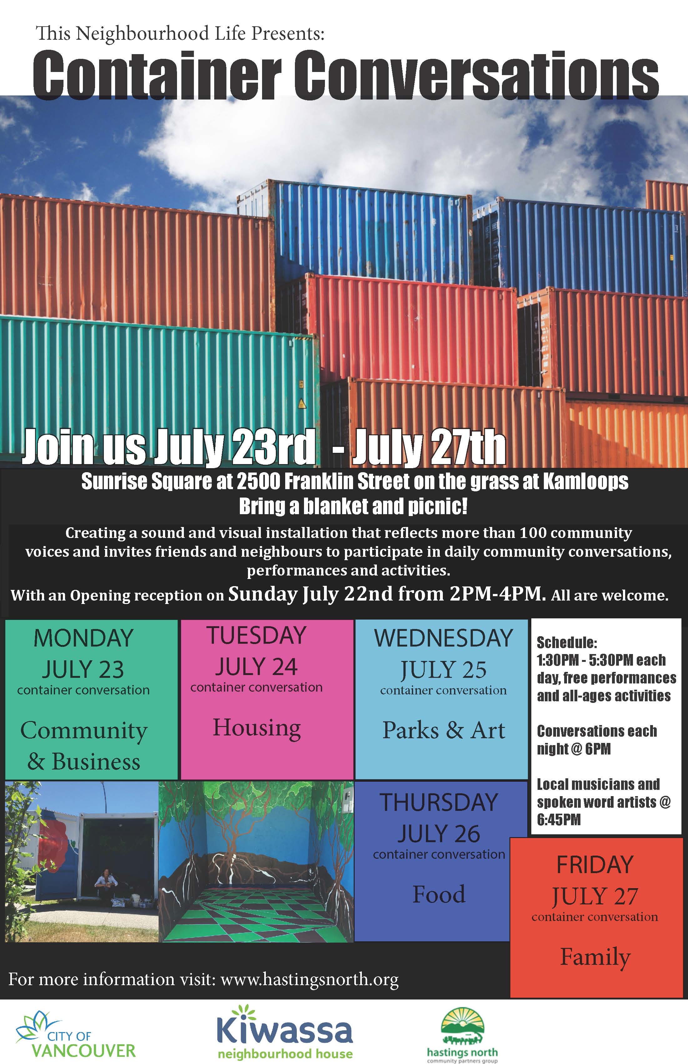 This year we wanted to build on what we had learned, but also to bring these conversations into the community – and the idea of Container Conversations was born! An art installation and a gathering place all in one, the container will be placed in the corner of the Sunrise Square parking lot the 23rd and 27th of July. Come and join us for daily activities, conversations and performances. All free, all welcome!