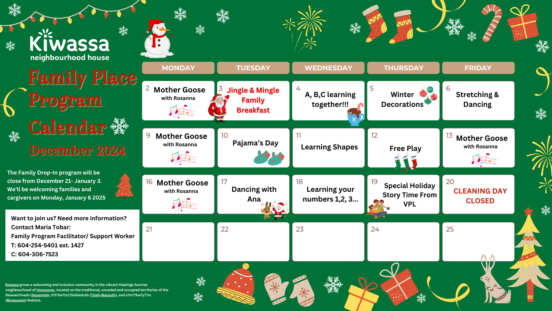 Details Date: December 5, 2024 Time: 9:30 AM - 12:00 PM Event Category: Family Programs Venue Kiwassa Neighbourhood House 2425 Oxford St, Vancouver, BC V5K 1M7 Canada + Google Map Phone: 604 254 5401 Add to calendar Google Calendar iCalendar Outlook 365 Outlook Live Share This
