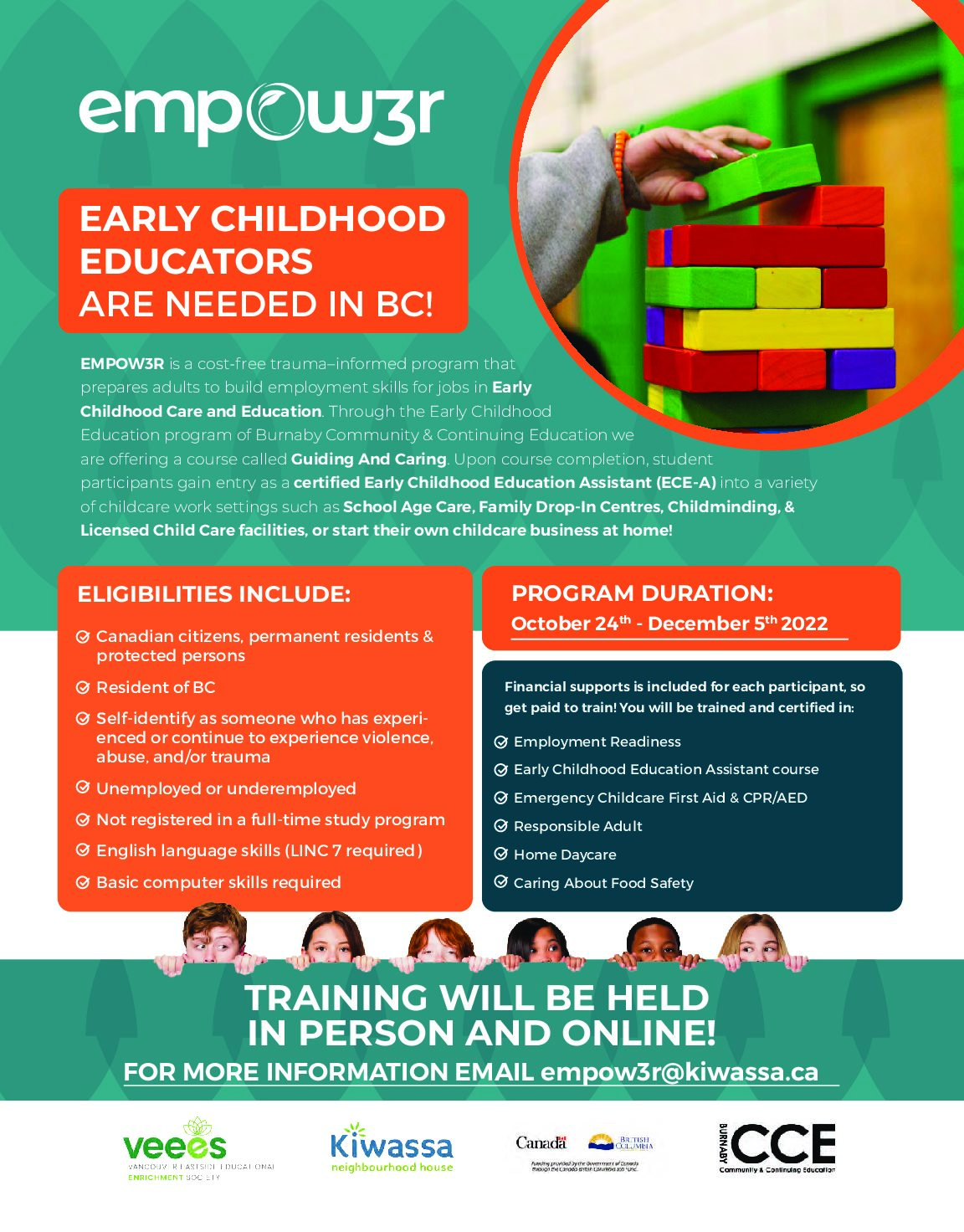EMPOW3R for childcare workers is open to individuals who wish to receive training to work in a variety of child care settings such as School Age Care, Family Drop-In Centres, or as support in Licensed Child Care Facilities. Candidates also have opportunities in preparing for their own child care business at their own homes!